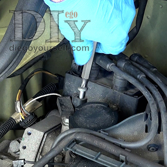 Débranchez la prise d'alimentation & pilotage de la bobine. Pour la retirer, vous devez serrer la bague en fil métallique qui dépasse sur le côté puis tirer vers le haut. Attention à ne pas tirer trop fort, car le fil qui la relie au condensateur antiparasites est plutôt court, il ne faudrait pas le casser :