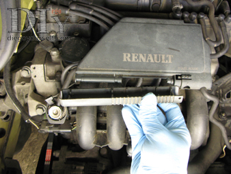 Ouvrez le boîtier de protection et routage des fils haute tension, en enlevant l'outil d'extraction des fils des bougies, il suffit de le faire glisser vers la gauche en appuyant sur le bouton qui le retient, puis de l'extraire :